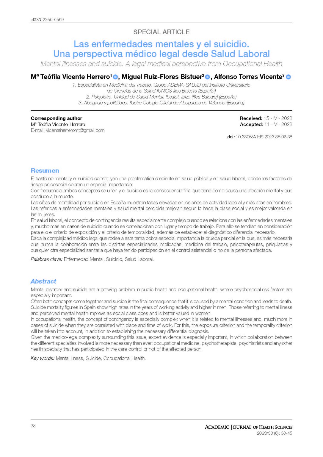 El trastorno mental y el suicidio constituyen una problemática creciente en salud pública y en salud laboral, donde los factores de riesgo psicosocial cobran una especial importancia.
